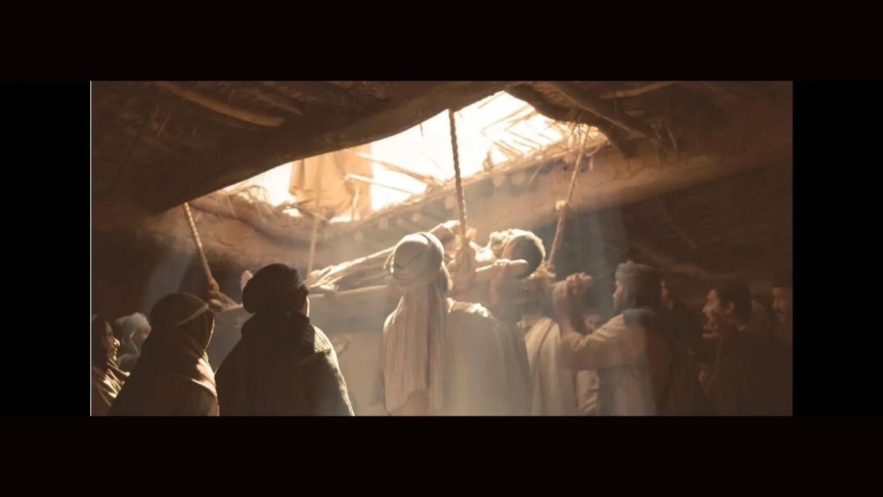 4) Since they could not get him to Jesus because of the crowd/horses, they made an opening in the roof above Jesus by digging through it and then lowered the mat the man was lying on.